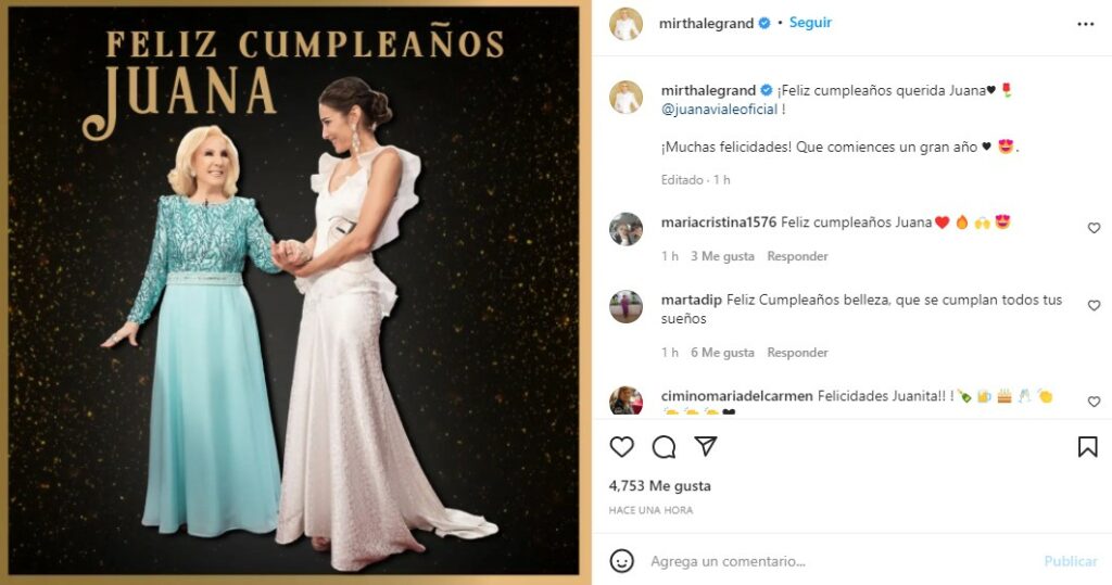 Junto a una foto del día que estuvieron haciendo el programa en El Trece juntas, Mirtha Legrand le expresó un cálido saludo de cumpleaños a Juana Viale. «¡Feliz cumpleaños querida Juana! ¡Muchas felicidades! Que comiences un gran año», escribió la famosa conductora, junto a varios emojis de corazones y flores, deseándole un gran día.