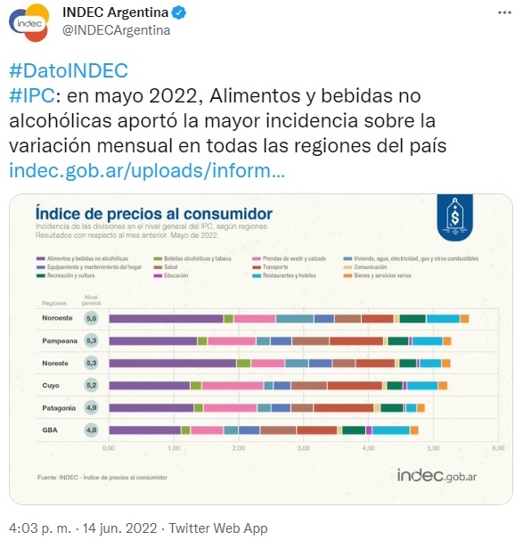 El Instituto Nacional de Estadísticas y Censo (Indec) confirmó este martes que la inflación de mayo fue de 5,1%. Al mismo tiempo, los precios al consumidor (IPC) subieron 60,7% interanual, la marca más alta en los últimos 30 años. En tanto, el organismo a cargo de Marco Lavagna precisó que el IPC acumuló «un alza de 29,3% en los primeros cinco meses del año».