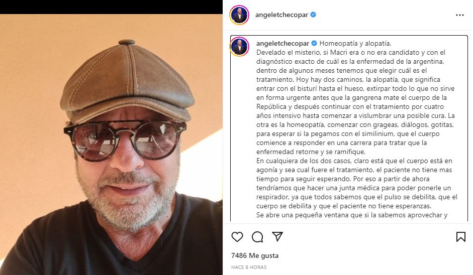 «La otra es la homeopatía, comenzar con grageas, diálogos, gotitas, para esperar si la pegamos con el similinium, que el cuerpo comience a responder en una carrera para tratar que la enfermedad retorne y se ramifique. En cualquiera de los dos casos, claro está que el cuerpo está en agonía y sea cual fuere el tratamiento, el paciente no tiene mas tiempo para seguir esperando», lanzó.