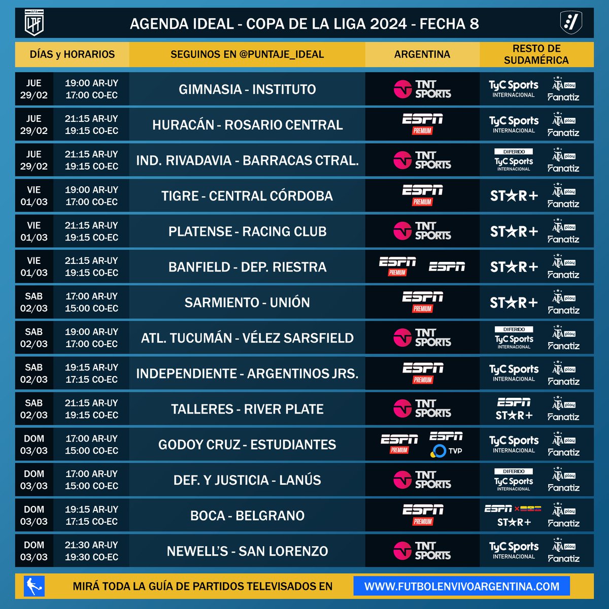 El viernes sigue la fecha con otros tres partidos. A las 19hs, Tigre recibe a Central Córdoba en Victoria, con transmisión de ESPN Premium. A las 21.15hs, además de Banfield vs. Riestra, Platense hace de local en Vicente López ante Racing, por la pantalla de TNT Sports.