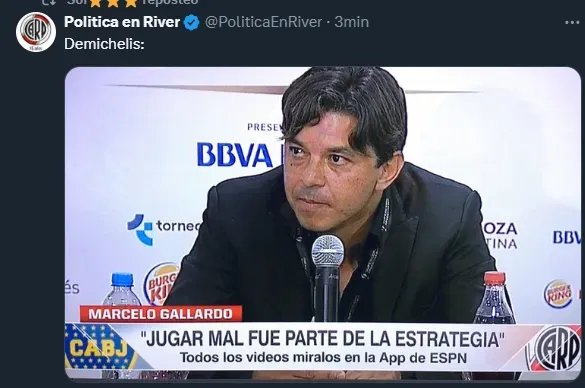 “No es casualidad que cuando Enzo salió hoy pudimos hacer los dos goles porque es un enorme jugador. Y cuando llegué a River fue uno de los primeros con los que hablé porque sabía que tenía mucho para darnos”, agregó el DT. Que como suele ocurrir volvió a ser el protagonista de los memes tras la victoria de River, por lo bueno y por lo malo.