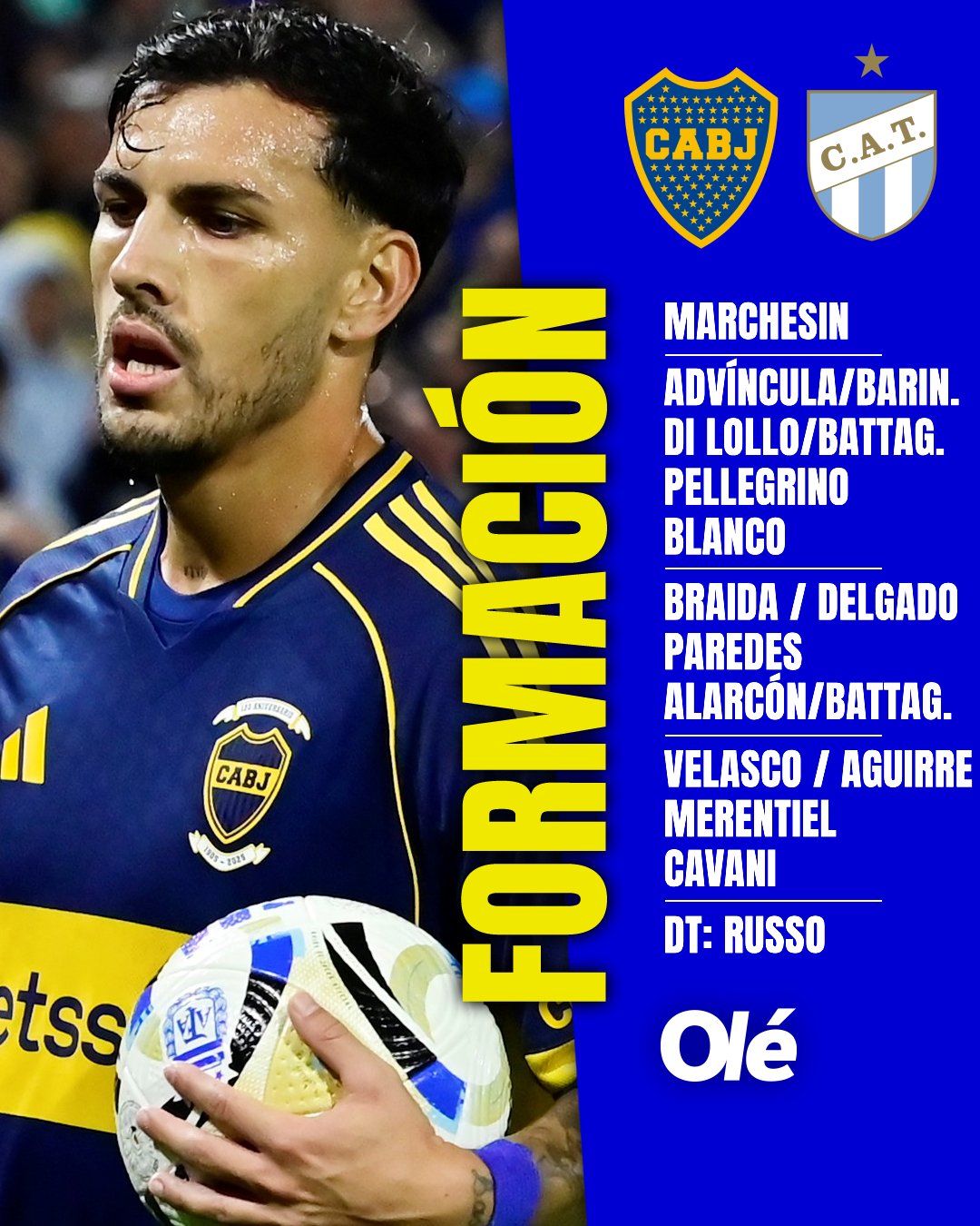 Así las cosas, el 11 titular de Boca vs. Atlético Tucumán por Copa Argentina tiene como posible formación a: Agustín Marchesín, Luis Advíncula o Juan Barinaga, Lautaro Di Lollo o Rodrigo Battaglia, Marco Pellegrino, Lautaro Blanco; Malcom Braida o Brian Aguirre, Leandro Paredes, Milton Delgado o Williams Alarcón, Alan Velasco; Edinson Cavani y Miguel Merentiel.