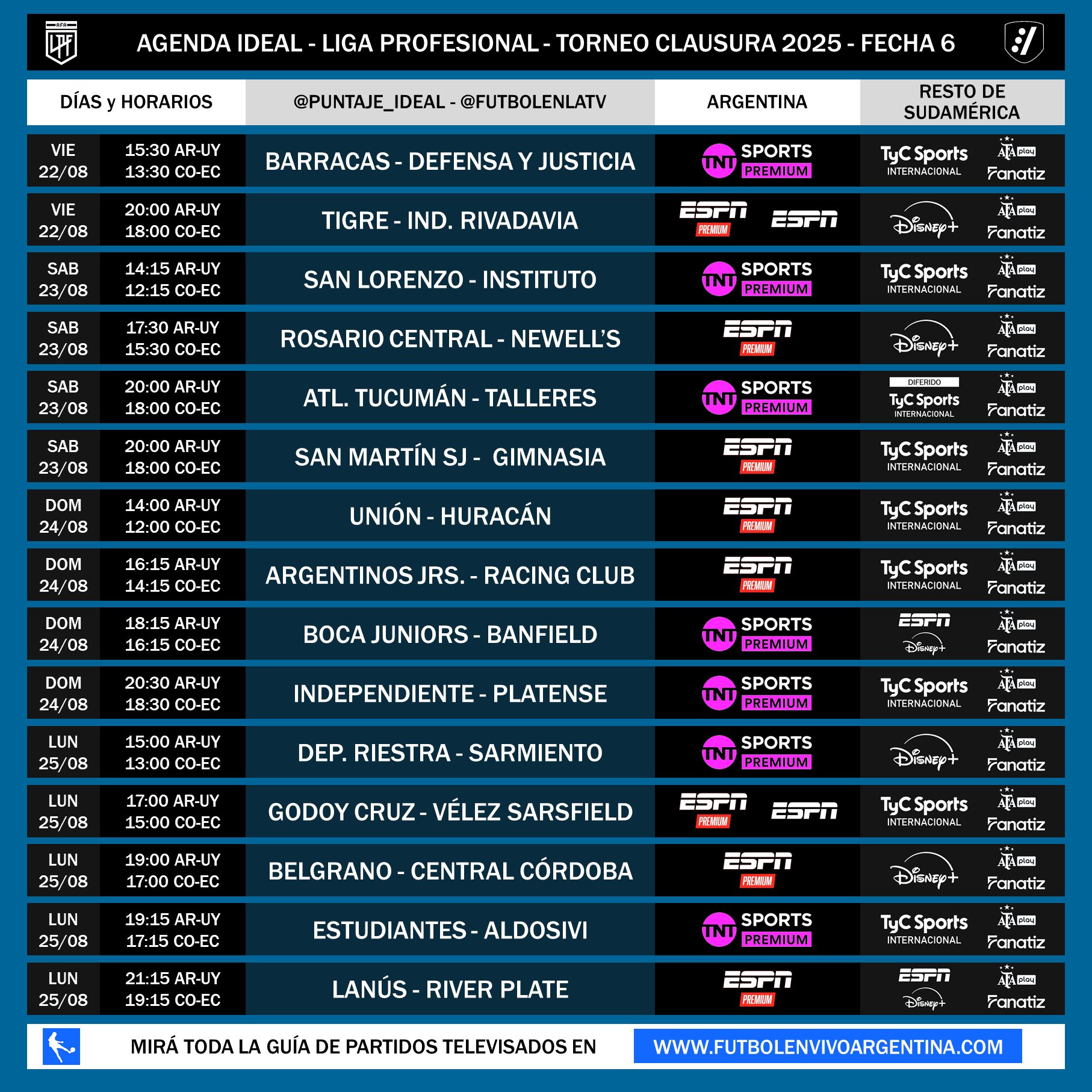Más tarde, Boca recibe a Banfield en La Bombonera desde las 18.15hs, por TNT Sports Premium. Por la noche, Independiente es local de Platense, a las 20.30hs, por TNT Sports Premium. Ya el lunes, la Fecha 6 del Torneo Clausura 2025 finaliza con cinco partidos.
