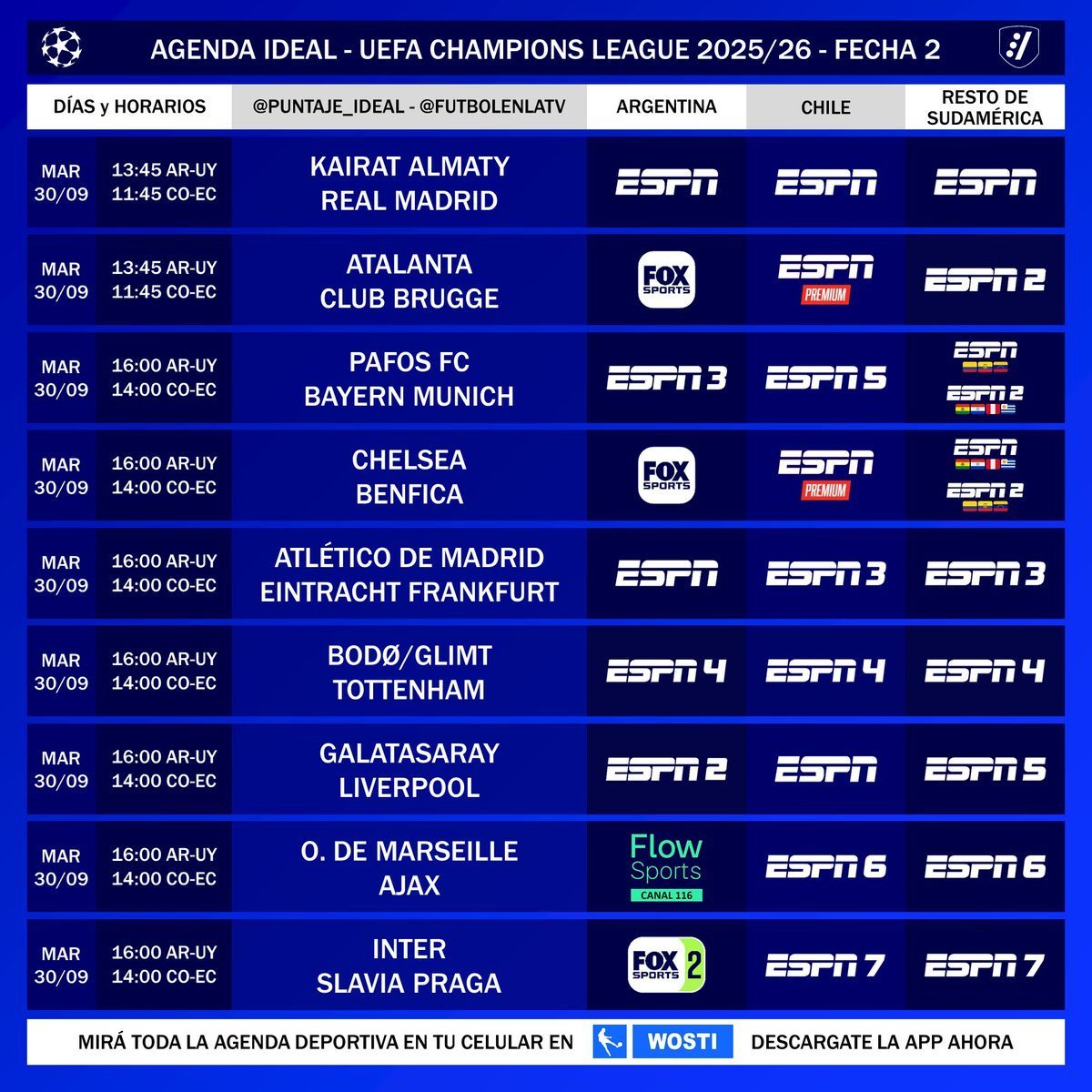 Este martes 30 de septiembre arranca la Fecha 2 de la Champions League 2025-2026 y lo hace con grandes partidos. A primer turno, desde las 13.45hs de Argentina, juega el Real Madrid de Franco Mastantuono, que visita al Kairat Almaty de Kazajistán, por la pantalla de ESPN. A la misma hora, Atalanta es local de Brujas, por Fox Sports.