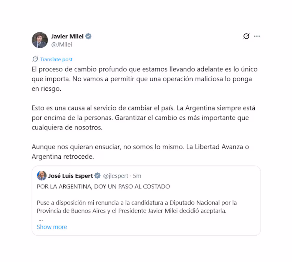 El presidente Javier Milei se pronunció tras la renuncia de José Luis Espert a su candidatura a diputado nacional por la provincia de Buenos Aires. Lo hizo a través de un mensaje en X, donde ratificó su apoyo y pidió preservar el rumbo del Gobierno.