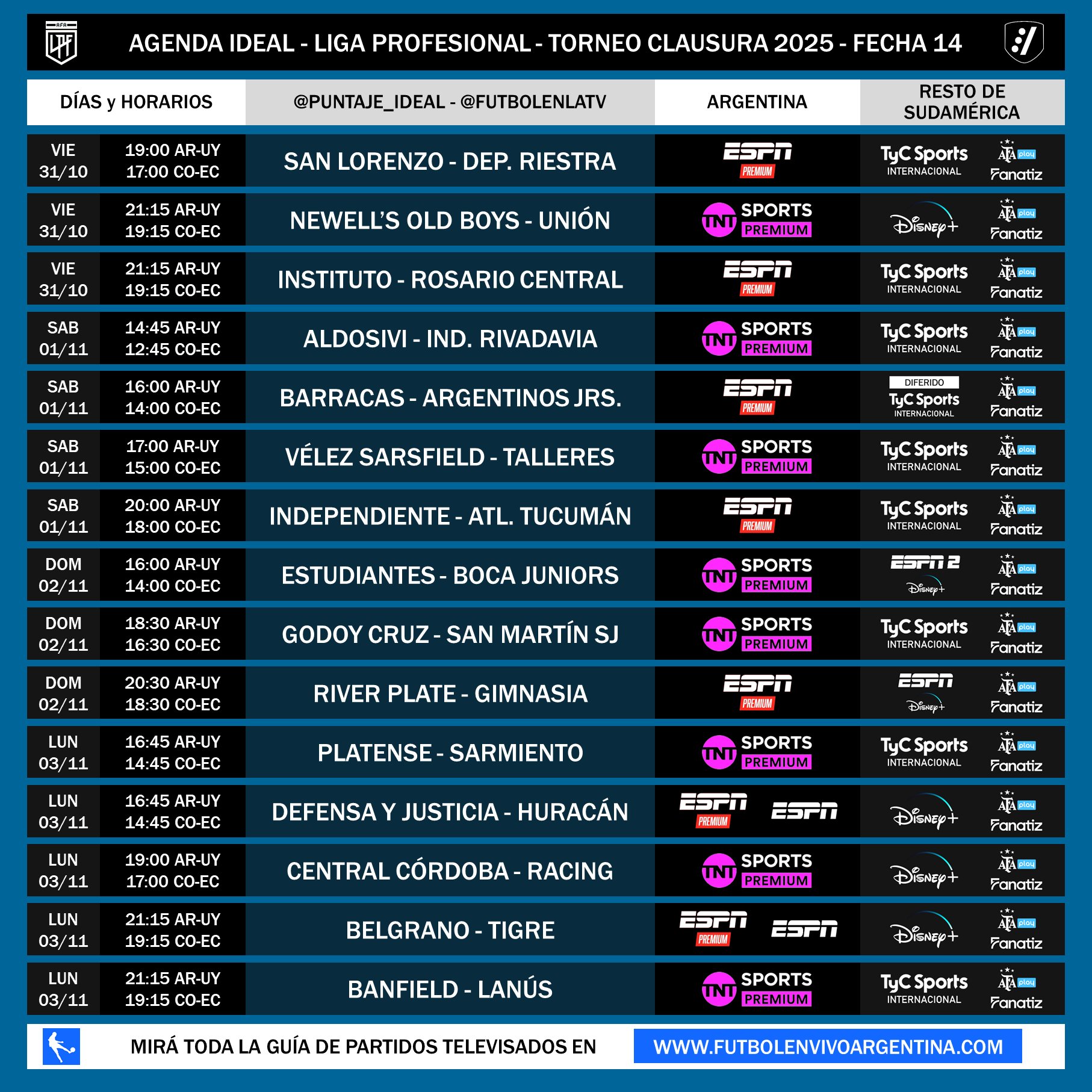 También el viernes a las 21.15hs juegan Instituto y Rosario Central por ESPN Premium. El sábado, sigue la Fecha 14 del Torneo Clausura 2025 con el choque entre Aldosivi e Independiente Rivadavia, desde las 14.45hs, por TNT Sports Premium. Y Barracas ante Argentinos, por ESPN Premium, a las 16hs.