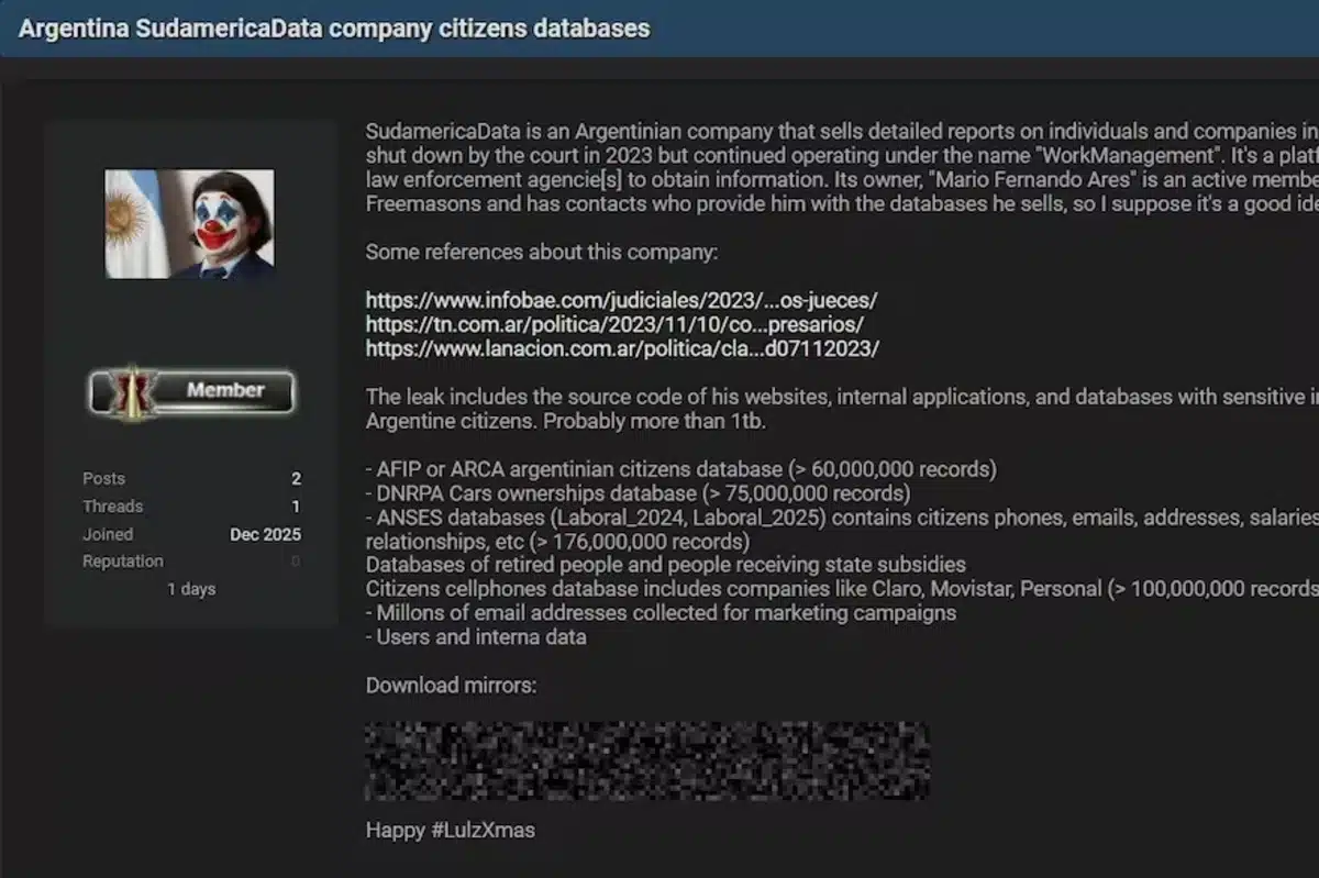 El sitio especializado Daily Dark Web denunció este jueves una filtración masiva de datos de ciudadanos argentinos que podría convertirse en la más grande registrada hasta ahora en el país, con información sensible atribuida a bases de ARCA, ANSES, registros automotores y compañías de telefonía móvil.