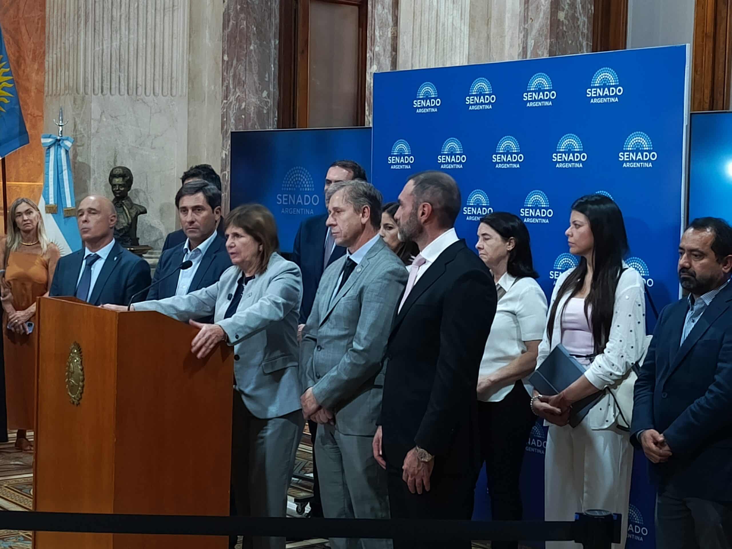 Acompañaron la conferencia el jefe del bloque de la UCR, Eduardo Vischi, y el senador del PRO, Martín Goerling, entre otros dirigentes que confirmaron su apoyo. Bullrich sostuvo que la reforma “se construyó con muchas horas de trabajo” y que incluye “28 modificaciones consensuadas que llegaron a buen puerto después de meses de diálogo”.