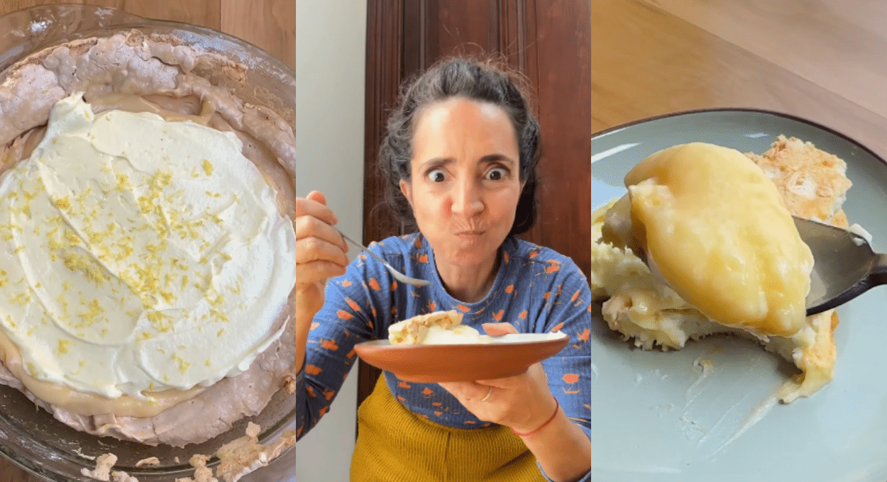 «Primero el merengue, después la crema ácida, y abajo esa base crocante que sostiene todo como el horóscopo sostiene nuestras decisiones. Bueno las mías no pero el chat tiró esa y lo dejé. Este lemon pie es un postre fácil, o sea lleva su tiempo de horno pero suele salir muy bien. ¿Estética? Lo importante es lo de adentro. No sean así», dijo con humor.