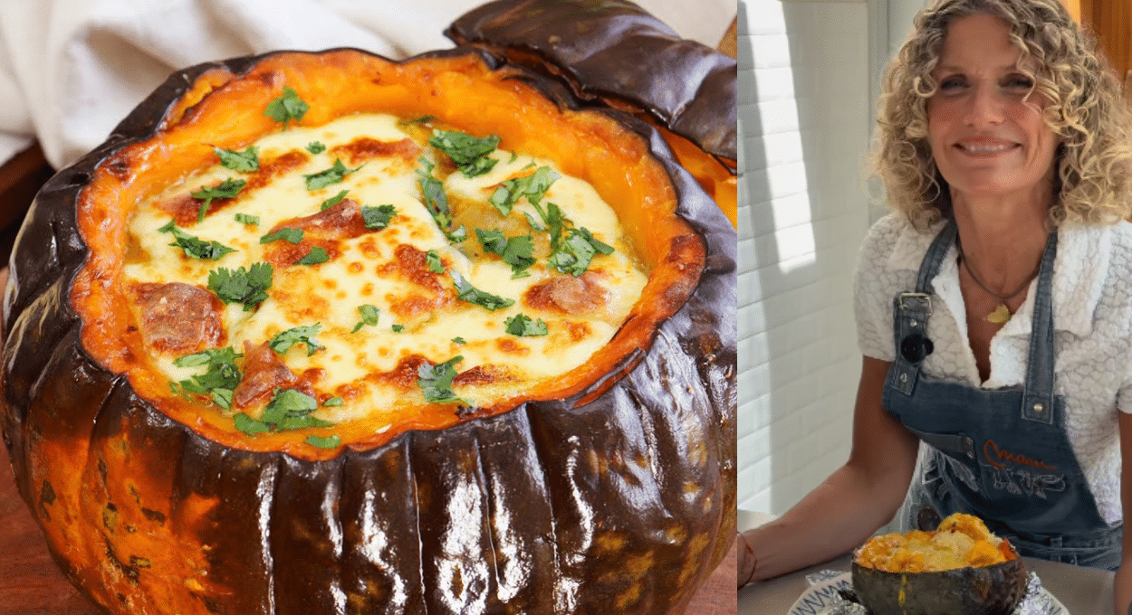 «A los langostinos les saco las cascaritas y, con eso más unos restos de verdura, hago un caldito rápido que después suma muchísimo sabor. Cuando el cabutia está tierno, le retiro la pulpa y la mezclo con el sofrito. Agrego un chorrito del caldo, queso cuartirolo, choclo cocido y los langostinos. Mezclo bien… jy esa mezcla va directo adentro del zapallo! Arriba un poquito de queso rallado, al horno a gratinar… y listo. Tremendo recetón, súper sabroso, fácil y recontra rendidor», sentenció Maru Botana.