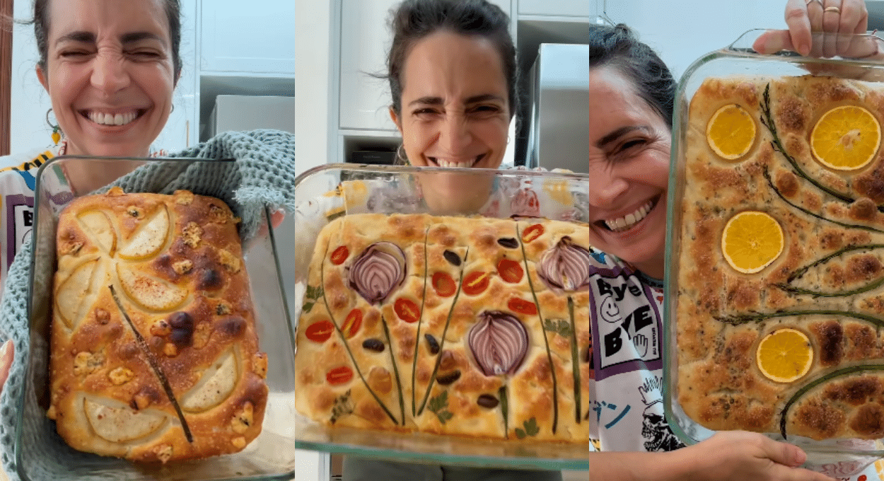 «Esta focaccia al horno no solo es ese acompañamiento estrella para tus comidas, sino que también es la diva de cualquier mesa», manifestó la cocinera. «Es súper económica. 750 ml de agua con muy poquita levadura. Disolvés un kilo de harina con una cucharada de sal, agua con levadura en el centro. También aceite de oliva. Mezclás y una vez que está todo unido, la hacés unos pliegues», explicó.