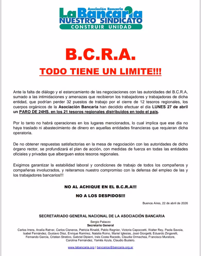 El conflicto estalló luego de que las autoridades del Banco Central dieron a conocer esta noticia que afecta a tesorerías regionales en distintas provincias. Según la Asociación Bancaria, esta medida pone en riesgo al menos 32 puestos de trabajo y se tomó sin un diálogo previo con los representantes de los empleados.