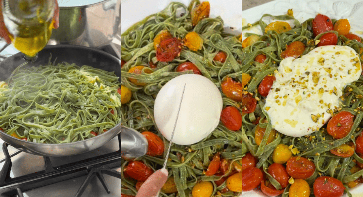 «La pasamos directo a la sartén con los tomates junto con un poco de agua de cocción. Sumamos queso rallado, mezclamos bien y servimos. Terminamos con una burrata bien cremosa, un chorrito de oliva y más pistachos… ¿qué más se puede pedir? Una receta simple, pero con todo el sabor de lo hecho en casa. Tomates, pistachos, pasta fresca y esa burrata que lo hace TODO. Amasen, de verdad… porque es un plan hermoso y el resultado es espectacular», finalizó Maru Botana.